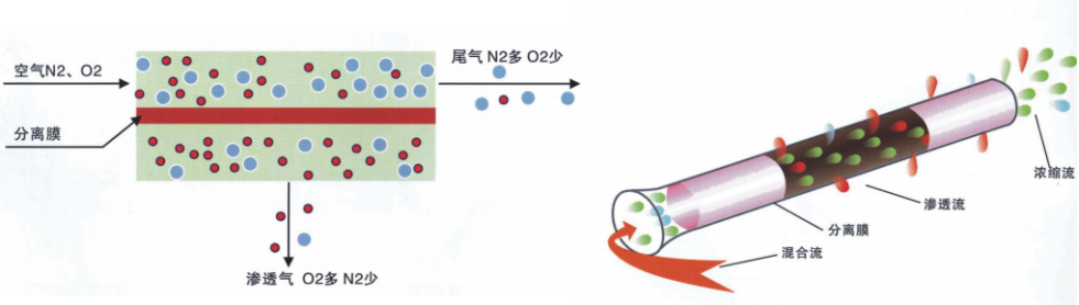 膜分離制氮機(jī)技術(shù)是根據(jù)空氣中的氮?dú)夂脱鯕庠谀蓚?cè)壓差作用下,在膜中的溶解度和擴(kuò)散系數(shù)不同而實現(xiàn)分離的,滲透率快的水蒸汽、氧氣等一些氣體先透過膜,成為富氧氣體,而滲透率較慢的氮?dú)鈩t滯留富集,成為干燥的富氮?dú)怏w,達(dá)到氧氮分離的目的。