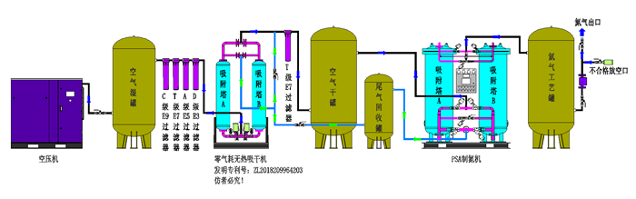 環(huán)境空氣經(jīng)壓縮凈化,除去油、水、塵后,進(jìn)入由兩個裝填有碳分子篩的吸附塔組成的變壓吸附裝置。壓縮空氣由下至上流經(jīng)吸附 塔,其間氧分子在碳分子篩表面吸附,氮氣由吸附塔上端流出,進(jìn)入粗氮緩沖罐,經(jīng)過一段時間后,吸附塔中碳分子篩被吸附的氧飽和,需進(jìn)行再生。再生是通過停止吸附步驟,降低吸附塔壓力來實現(xiàn)的。兩個吸附塔交替進(jìn)行吸附和再生,從而確保氮氣的連續(xù)輸出。